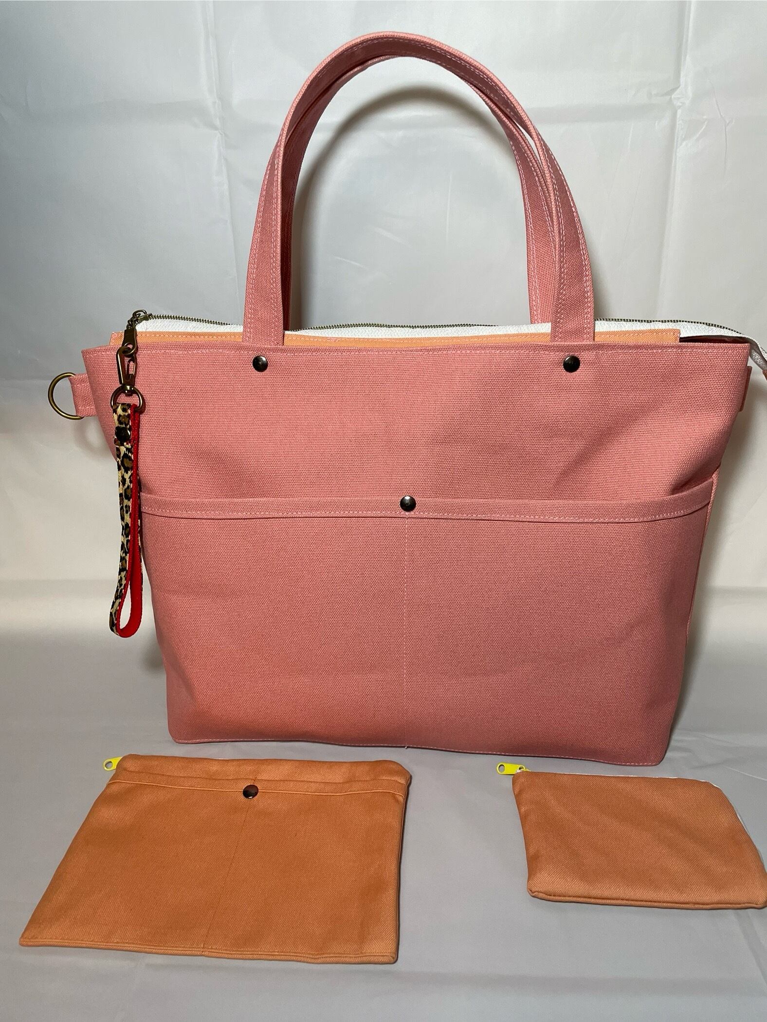 ポケットは前面に2つ、内側にファスナー付と付いてないのと2つあります。